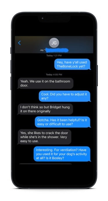 Fun: Bridgett loves TheBoneLock because she likes to take hot showers and her 150-pound Anatolian Shepherd doesn’t understand that she leaves the door open to let the steam out, NOT to let him in the shower with her. Needless to say, her showers have gotten a lot more enjoyable with TheBoneLock.